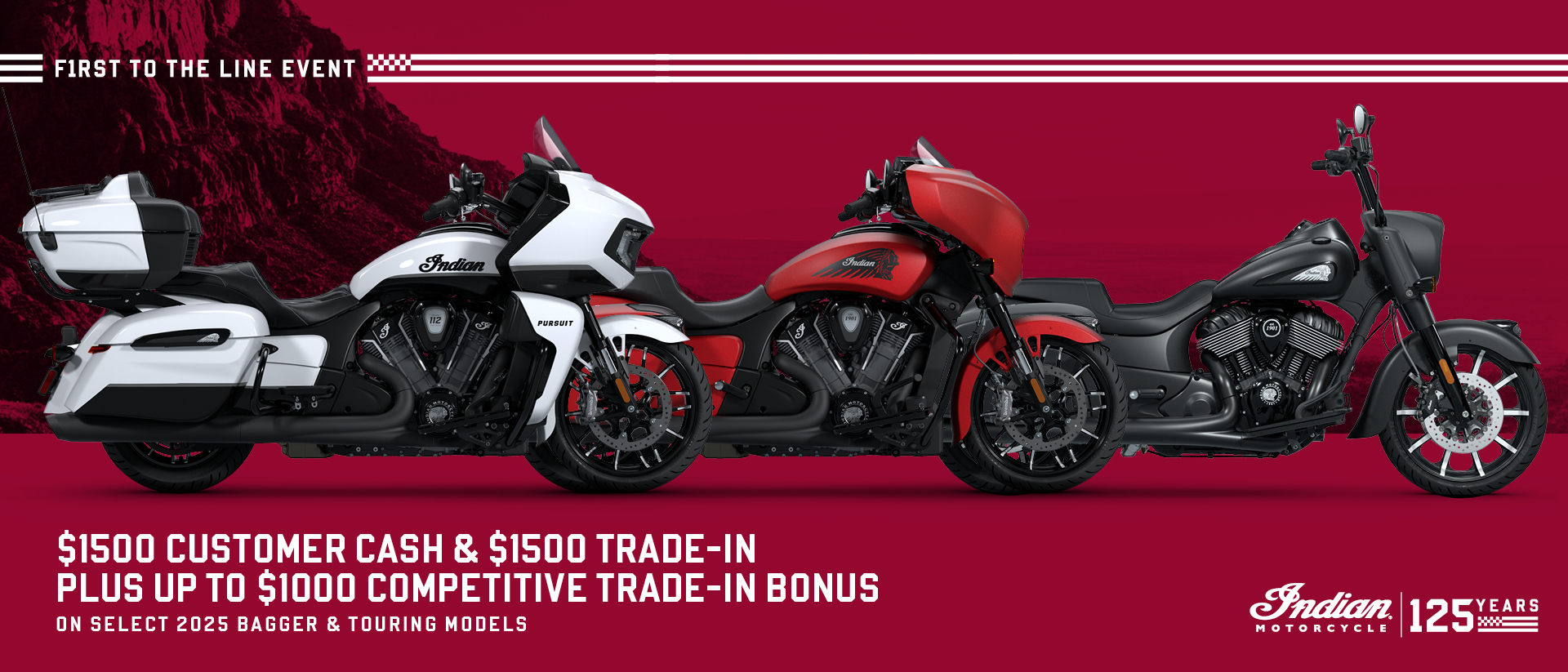"*2025 Chieftain, Chieftain PowerPlus, Indian Challenger, Indian Pursuit, Roadmaster, Roadmaster PowerPlus, or Indian Springfield $1,500 Trade-In Credit This is a limited time offer which consists of $1,500 Trade-In Credit towards the purchase of a new model year 2025 Chieftain, Chieftain PowerPlus, Indian Challenger, Indian Pursuit, Roadmaster, Roadmaster PowerPlus or Indian Springfield models. Excludes Elite models. This offer is subject to change and may be extended or terminated without further notice. Offer may be combined with valid customer cash offers, but may not be combined with promotional financing. All rebates paid to dealer and are not redeemable for cash. Offer Valid: March 1 – 31, 2026.