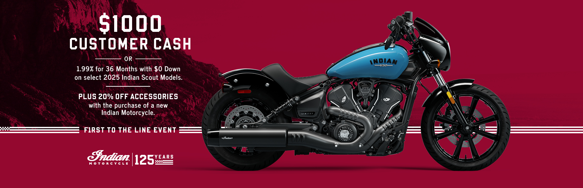 Promotion: $1000 CUSTOMER CASH OR 1.99% for 36 Months with $0 Down on select 2025 Indian Scout Models. PLUS 20% OFF ACCESSORIES with the purchase of a new Indian Motorcycle.