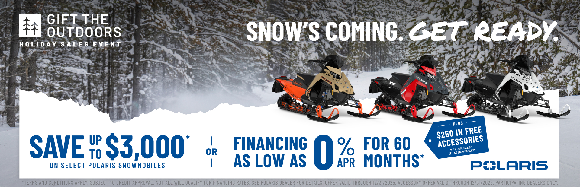 Polaris Snowmobiles is offering financing as low as 0% got 60 months OR up to $3,000 off on select snowmobiles for Holiday Sales Event - Gift the Outdoors.